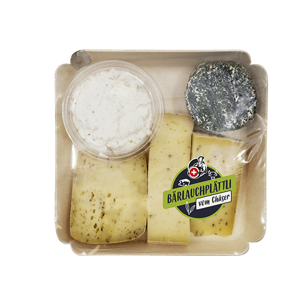 Das perfekte Plättli für alle, die Bärlauch mögen. Enthält fünf Käsekreationen: Frischkäse mit Bärlauch, Bärlauch-Chäsli, Weissschimmel-Chäsli im Bärlauchmantel, Bärlauchtroum und Bärlauchmutschli.