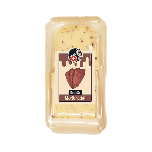 Zart schmelzend und mild-würzig schmeckender Raclettekäse. Die edlen Mostbröckli aus der Ostschweiz zusammen mit dem Käse ergeben ein besonders gutes Geschmackserlebnis.